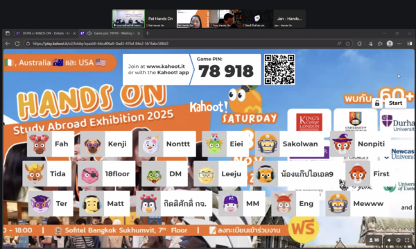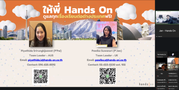 ภายในงานพี่ ๆ Hands On ได้ให้ข้อมูลการวางแผนเรียนต่อต่างประเทศแบบครบทุกประเด็น ไม่ว่าจะเป็น การวางแผนศึกษาต่อต่างประเทศอย่างมีเป้าหมาย, แนะนำขั้นตอนและเอกสารที่ต้องใช้ในการสมัคร, ข้อมูลคอร์สและมหาวิทยาลัย และ ระยะเวลาการเปิดรับสมัครของแต่ละประเทศ หลังจากเสร็จสิ้นช่วงการบรรยายพี่ Hands On ได้มีกิจกรรมตอบคำถามจากเกม Kahoot และมีของขวัญพิเศษเป็นคอร์สติว IELTS ออนไลน์ฟรี จำนวน 2 รางวัลให้กับผู้ชนะในครั้งนี้