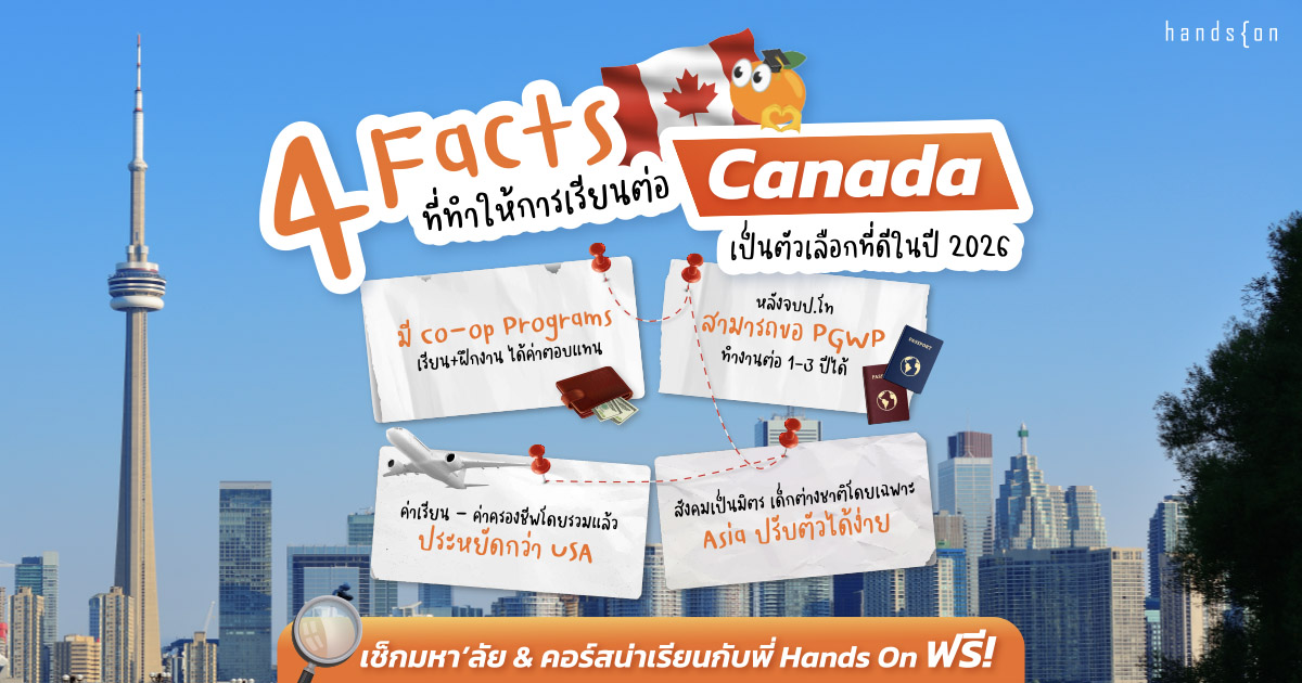 อ่านมาถึงตรงนี้แล้วน้อง ๆ หลายคนคงเริ่มที่จะเห็นแล้วว่าการเรียนต่อที่แคนาดานั้นเป็นตัวเลือกที่ดีไม่น้อยเลยในปี 2026 นี้ นอกจากเป็นประเทศที่อยู่แล้วสบายใจแล้ว คุณภาพการศึกษาและประสบการณ์พิเศษที่จะได้นั้นมีเยอะ ซึ่งจริง ๆ แล้วในบทความนี้พี่ Hands On สรุปมาแค่หัวใจหลักสำคัญเท่านั้น ยังมี Facts และรายละเอียดอีกมากมายที่พี่ยังไม่ได้พูดถึงเกี่ยวกับข้อดีของการเรียนต่อที่แคนาดา ใครที่รู้สึกสนใจและอยากได้ข้อมูลที่เจาะลึกขึ้นอีกไม่ว่าจะเป็นคอร์สหรือมหาวิทยาลัยชั้นนำก็สามารถติดต่อสอบถามกับพี่ Hands On ที่เป็นผู้เชี่ยวชาญได้แบบตัวต่อตัว ไม่มีค่าใช้จ่าย!