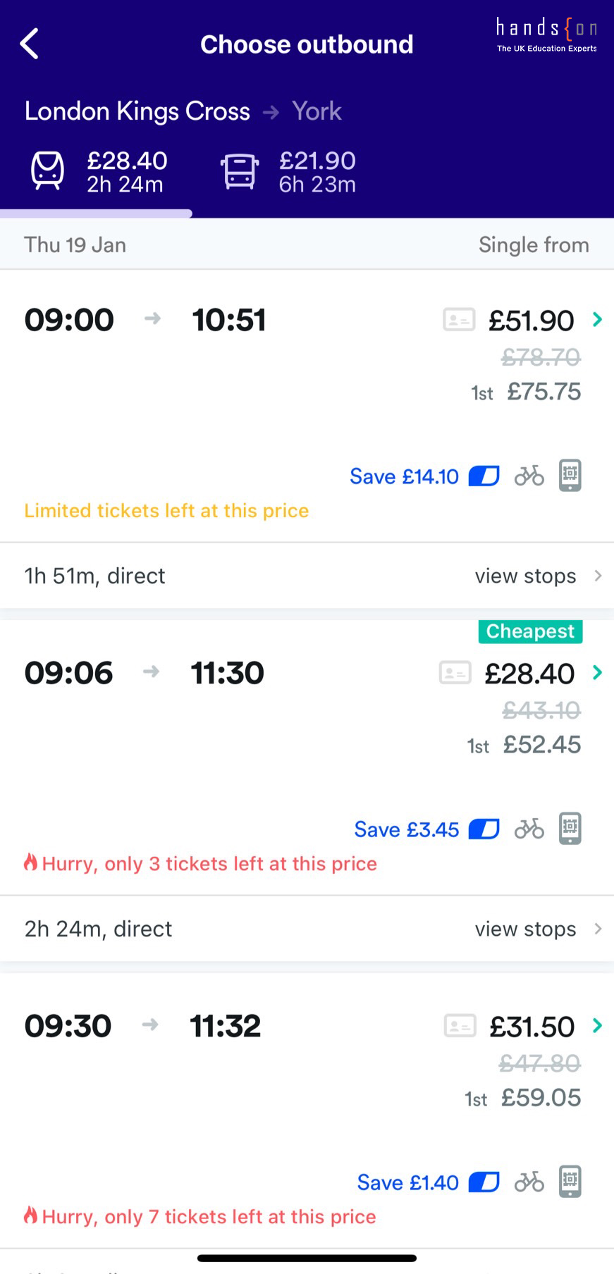 พอเปิดเข้าไปก็จะหน้าตาประมาณนี้ค่ะ หน้าแรกจะให้เราใส่ชื่อสถานีต้นทางและสถานีปลายทาง เลือกวันและเวลาที่ต้องการ จากนั้นก็เลือกได้ว่าจะซื้อตั๋วกี่ใบ สำหรับเด็กหรือผู้ใหญ่ จะเลือกเป็นตั๋วเที่ยวเดียวหรือตั๋วไปกลับก็ได้ หลังจากนั้นให้กด Find แล้วผลลัพธ์มันจะขึ้นมาแบบรูปที่สองค่ะ ราคาจะมีหลากหลายมาก เพราะรถไฟแต่ละสายอาจจะมีผู้ให้บริการคนละคน หรือรถไฟสายนี้อาจจะมีคนนั่งแน่นอยู่ตลอด ราคาก็จะแพงเป็นพิเศษ โดยแต่ละเที่ยวก็จะระบุว่าเป็นรถไฟสายตรงหรือต้องเปลี่ยนสถานีและเวลาเดินทางโดยประมาณตรงมุมล่างซ้ายค่ะ จะใช้สิ่งนี้ช่วยตัดสินใจซื้อตั๋วก็ได้ หรือจะใช้บรรทัดฐานที่หนักแน่นที่สุดในสังคมอย่างราคาก็ได้ ราคาที่ปรากฏอยู่บนแถบสีน้ำเงินด้านบนสุดคือราคาที่ถูกที่สุด จากนั้นก็ให้เลื่อนหน้าจอลงมาเรื่อย ๆ เพื่อกดจิ้มและซื้อนะคะ
