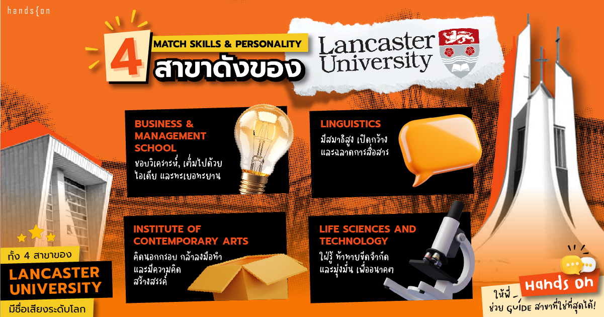 น้อง ๆ ที่สนใจเรียนต่อต่างประเทศต่างก็ต้องพิจารณาว่าตัวเองควรจะเลือกเรียนสาขาไหน น้อง ๆ แต่ละคนมีนิสัย วิธีคิด และแรงผลักดันที่ต่างกัน ซึ่งใน Lancaster University มีคณะดังมากมายให้น้องเลือก อย่าง “L-Series” ที่เป็นสาขาตัวท็อปของมหาวิทยาลัยทั้งหมด 4 สาขา แต่ละสาขาจะมีตัว “L” นำหน้า มาเช็กว่าตัวน้องเหมาะที่จะเข้าสาขาไหนไปพร้อมกับพี่ Hands On ได้เลย!