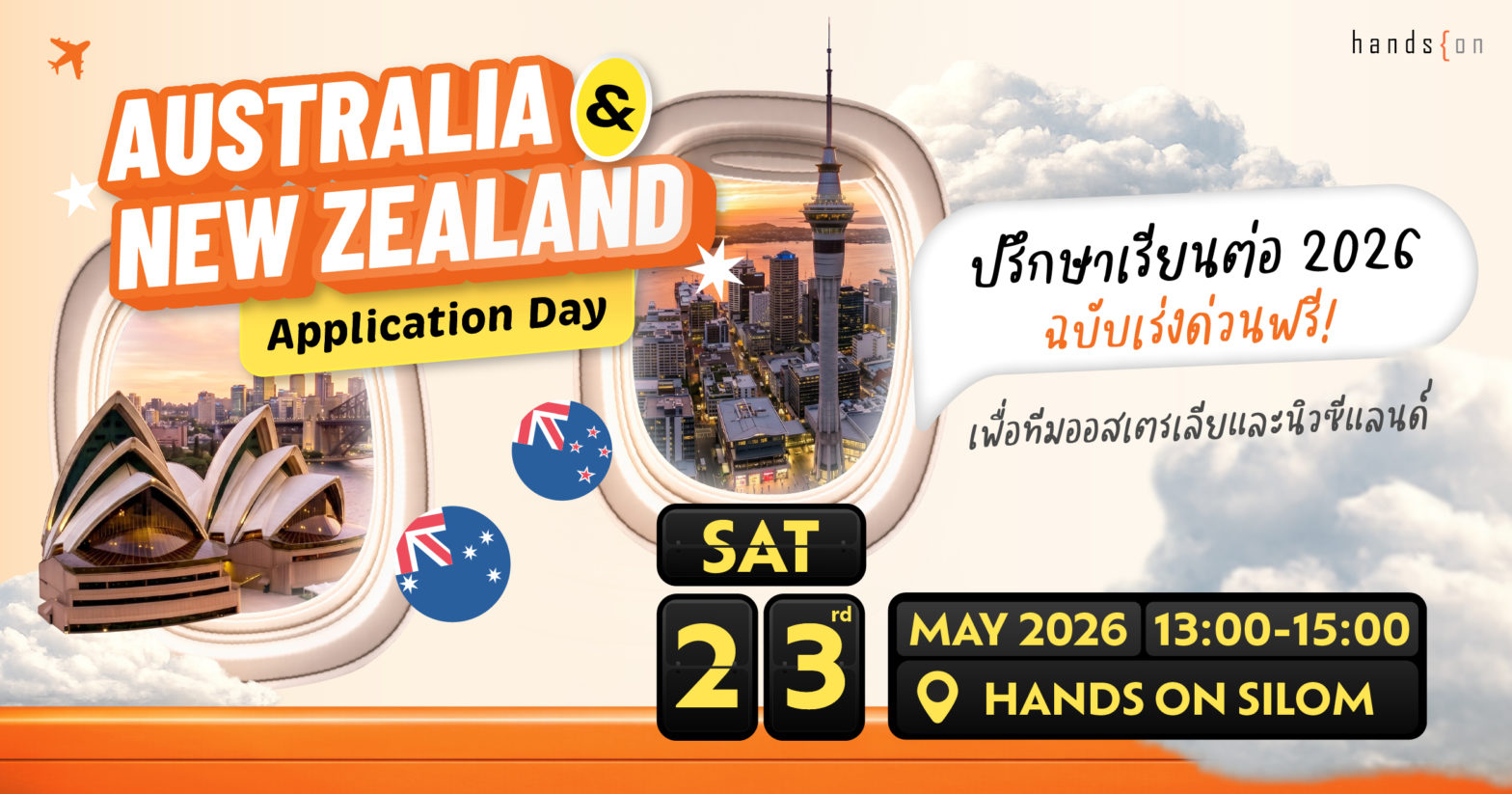 วางแผนเรียนต่อออสเตรเลียและนิวซีแลนด์กับผู้เชี่ยวชาญ ปักเดดไลน์ให้เป๊ะที่งาน Australia & New Zealand Application Day จัดโดย Hands On Education Consultants ผู้เชี่ยวชาญด้านการเรียนต่อต่างประเทศ และตัวแทนมหาวิทยาลัยอย่างเป็นทางการประจำประเทศไทย