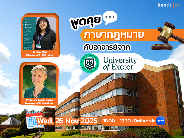 พี่ Hands On ขอเชิญชวนน้อง ๆ นักเรียนที่สนใจเรียนกฎหมายเข้าร่วมสัมมนาออนไลน์ University of Exeter Law Webinar | พูดคุยภาษากฎหมายกับอาจารย์จาก University of Exeter ที่น้อง ๆ จะได้ข้อมูลคอร์สกฎหมายฉบับอัปเดต และความพิเศษในหลักสูตร Community Law Clinic ของมหาวิทยาลัย ที่เปิดโอกาสให้นักศึกษาเก็บเกี่ยวประสบการณ์จริง ผ่านการให้คำปรึกษากฎหมายแก่ชุมชน