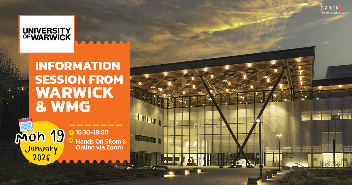 โอกาสดีสำหรับน้อง ๆ ที่วางแผนเรียนต่อสหราชอาณาจักร และต้องการทำความรู้จักกับมหาวิทยาลัยระดับท็อป เมื่อพี่ Hands On และ University of Warwick จัดกิจกรรมพิเศษ “Information session from Warwick and WMG” เชิญเจ้าหน้าที่มหาวิทยาลัยมาให้ข้อมูลเกี่ยวกับการวางแผนเรียนต่อ Warwick รวมถึงข้อมูลเจาะลึกของคณะ Warwick Manufacturing Group (WMG) โดยเฉพาะ