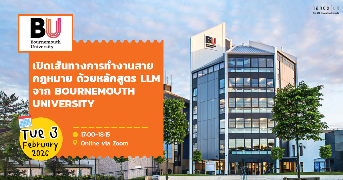 ⚖️ เด็กนิติคนไหนกำลังวางแผนเรียนต่อปริญญาโทสายกฎหมายห้ามพลาด เพราะในสัมมนานี้พี่ Hands On ขอพาน้อง ๆ ทำความรู้จักกับภาพรวมของการเรียน Law School ในสหราชอาณาจักร พร้อมทั้งเจาะลึกหลักสูตร LLM จาก Bournemouth University ว่านักเรียนกฎหมายที่นี่เรียนอะไร? จุดแข็งของที่นี่คืออะไร? และจะช่วยเพิ่มโอกาสการทำงานสายกฎหมายของน้อง ๆ ในอนาคตอย่างไรได้บ้าง?