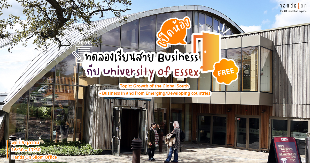 โอกาสดีสำหรับน้อง ๆ ที่สนใจเรียนต่อที่อังกฤษ โดยเฉพาะสาขา Business เมื่อพี่ๆ Hands On ร่วมมือกับ University of Essex มาเปิดคลาสเรียนเฉพาะกิจสุดพิเศษ พร้อมเคล็ดลับการเตรียมตัวเรียนต่อที่อังกฤษ กับสัมมนาทดลองเข้าห้องเรียนภายใต้หัวข้อ “Growth of the Global South – Business in and from Emerging/Developing countries”